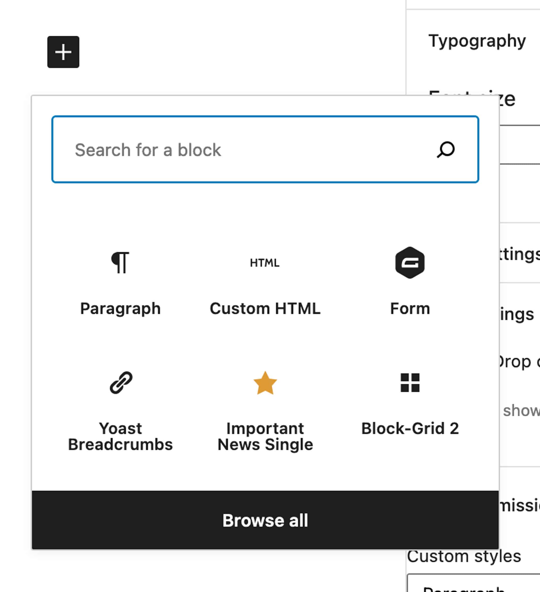 If you’ve clicked Add Block, a dialogue will appear with recently used blocks and a search bar.