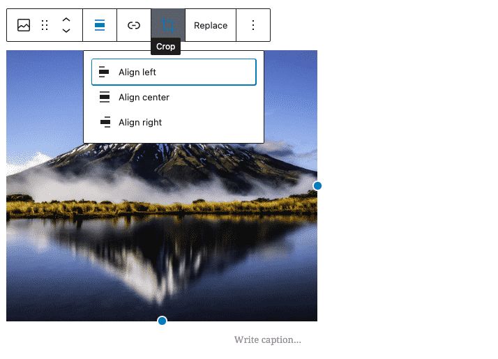 After selecting the image, you can Change Alignment (left, center, right) from the toolbar or Crop. You’ll also see blue dots on the right and bottom of the image that you can use to resize it and a caption area below.