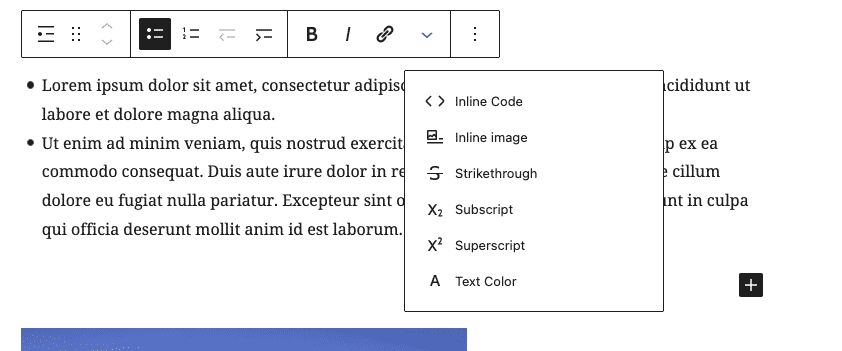 • More Options – Click the ellipsis (three vertical dots) on the far right to open the Other Options menu on the Block Toolbar: