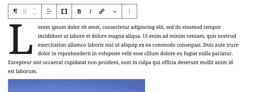 This common block has basic style and editing options in the toolbar above as well as the right sidebar. You can change font size, color, and even add a Drop Cap (Large first letter) if desired.