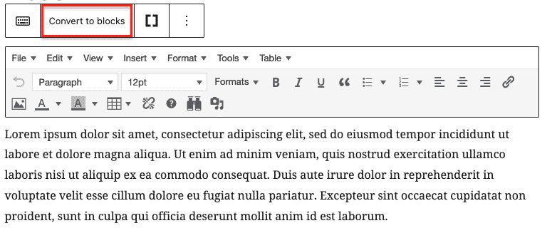 2. Your content created in the Classic Editor will show as a Classic Editor block: